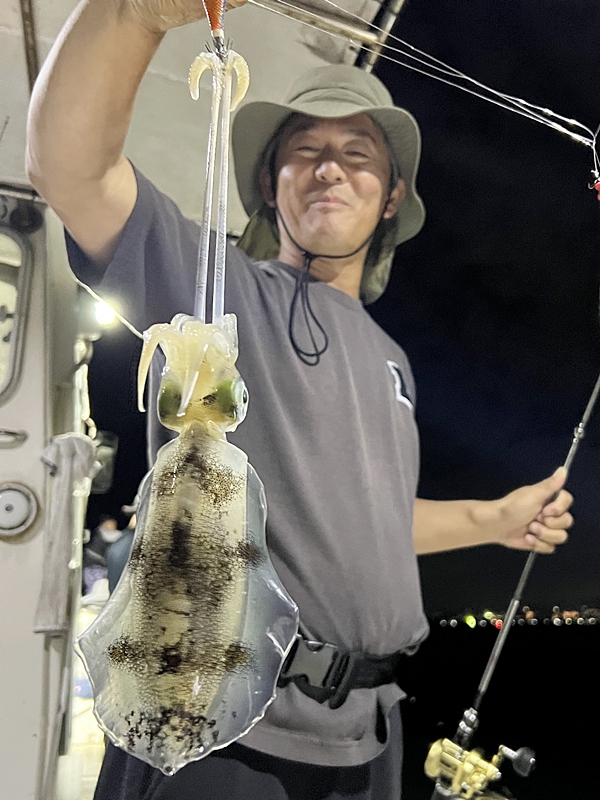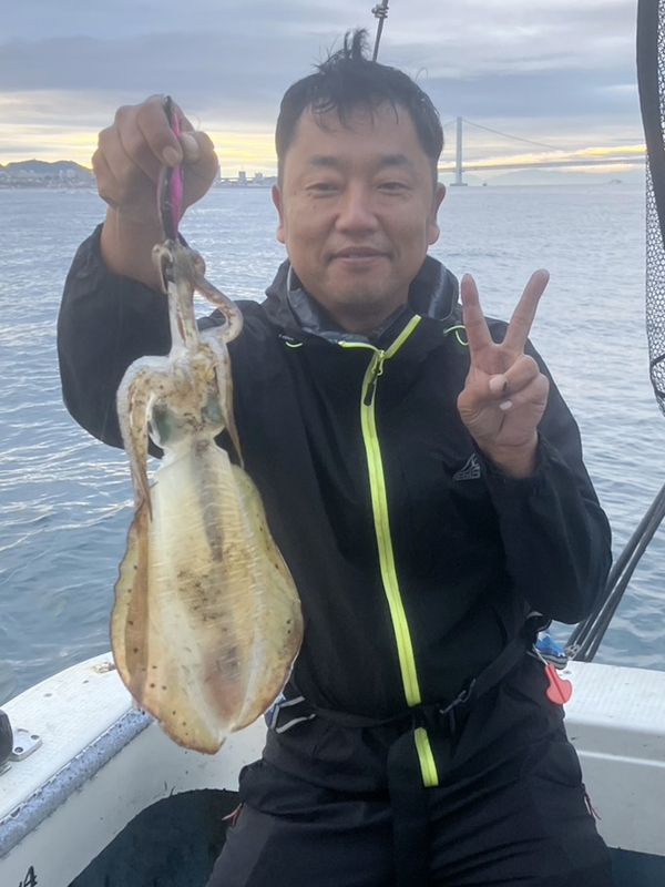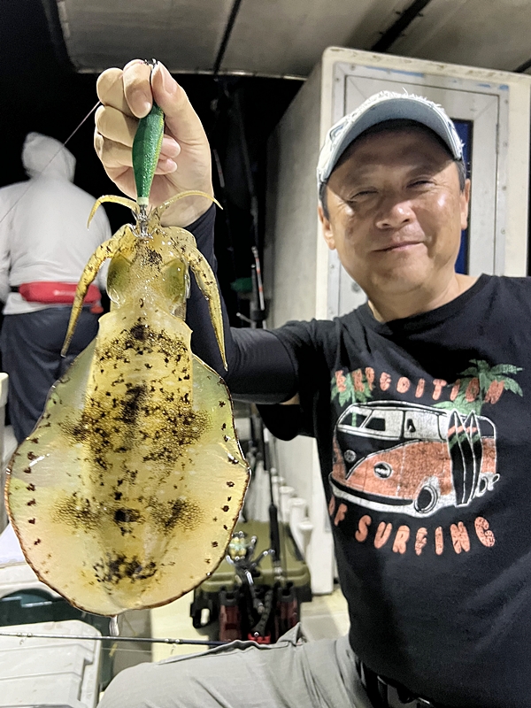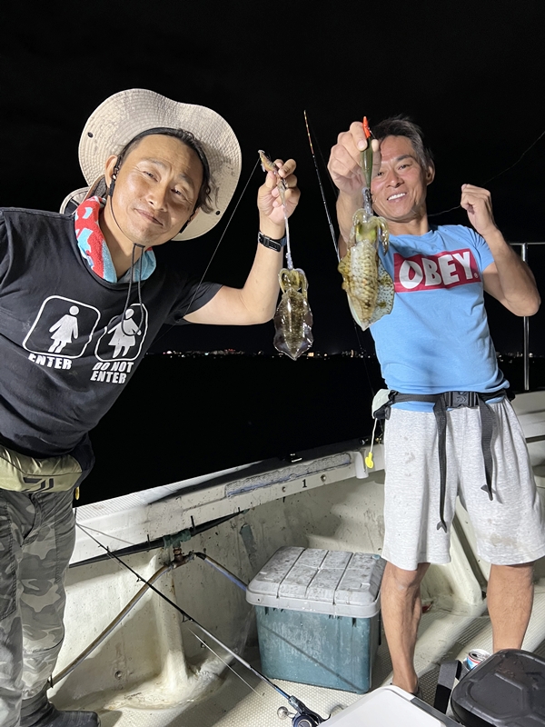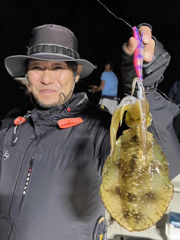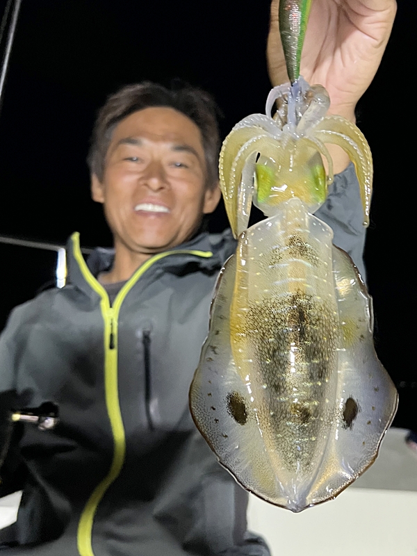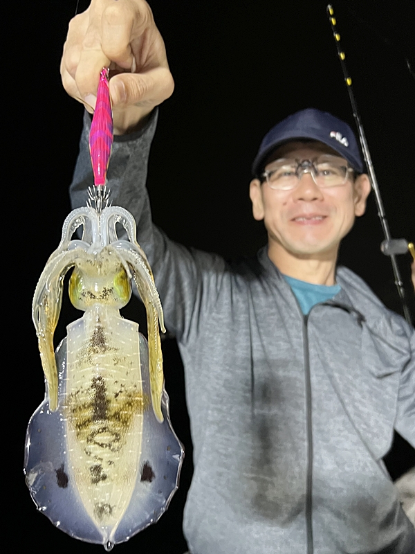 半夜便 晴れ アオリイカ便 (明石沖) アオリイカ12~19cmを43杯。 (0~11杯) ケンサキイカ14~15cmを2杯。 (0~1杯) コウイカ少々。 トップは薮井さんで11杯でした。