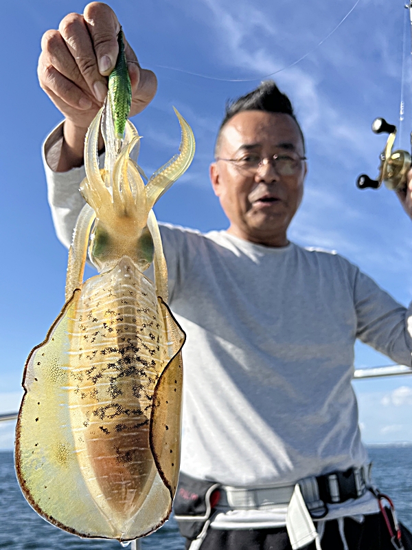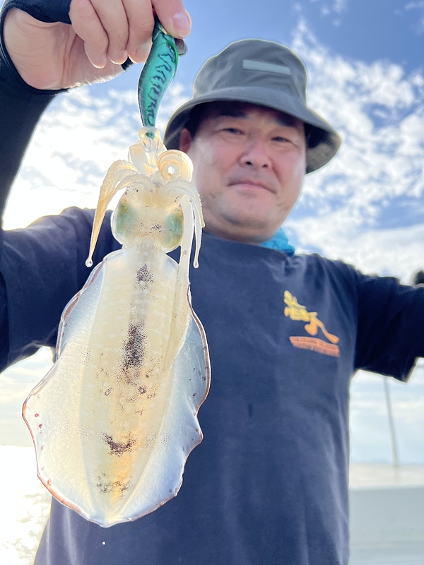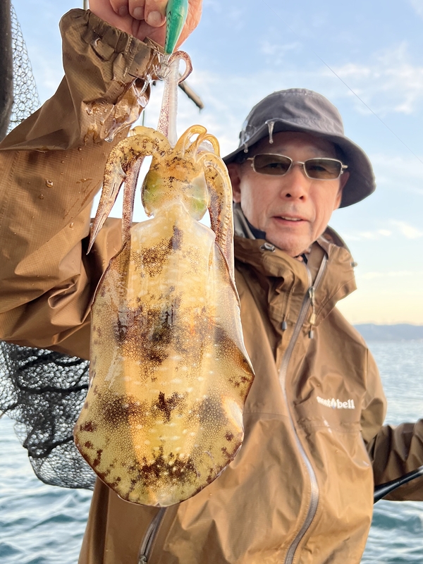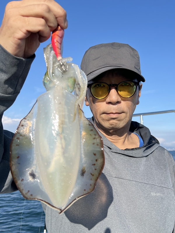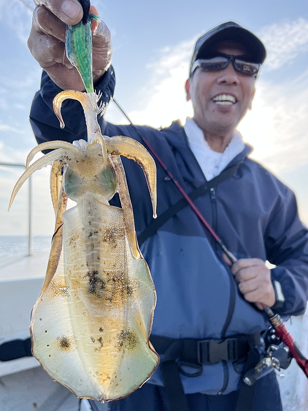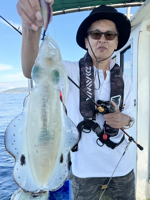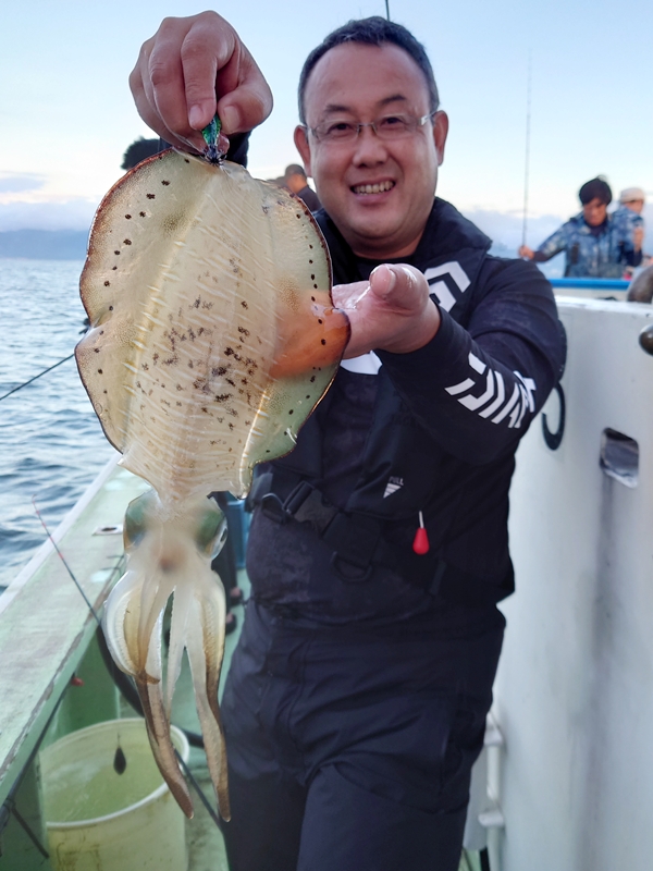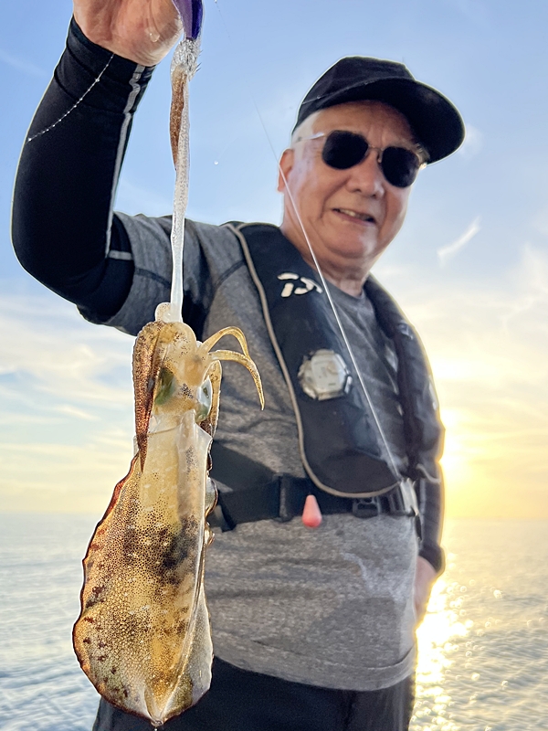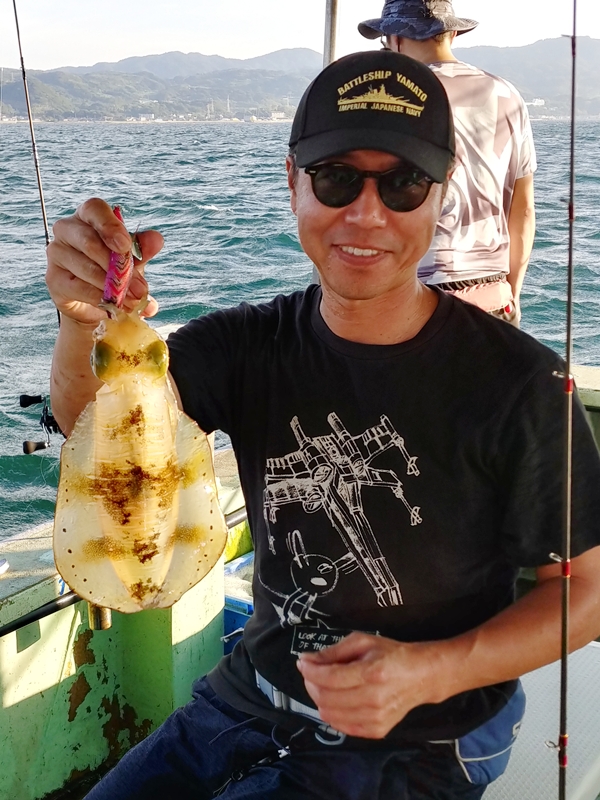 朝便 晴れ アオリイカ便 (淡路沖) アオリイカ20~25cmを17杯。 (0~3杯) コウイカ12~16cmを12杯。 (0~3杯) トップは横野さんでアオリ3杯、コウイカ3杯でした。 鯛カブラ便 (淡路沖) マダイ25~45cmを6匹。 (0~2匹) メジロ65cmを1匹。 トップは下江さんで2匹でした。 |