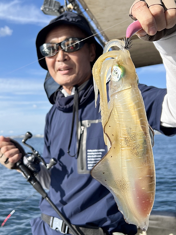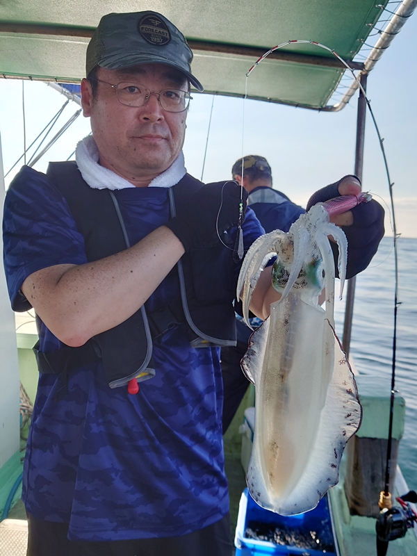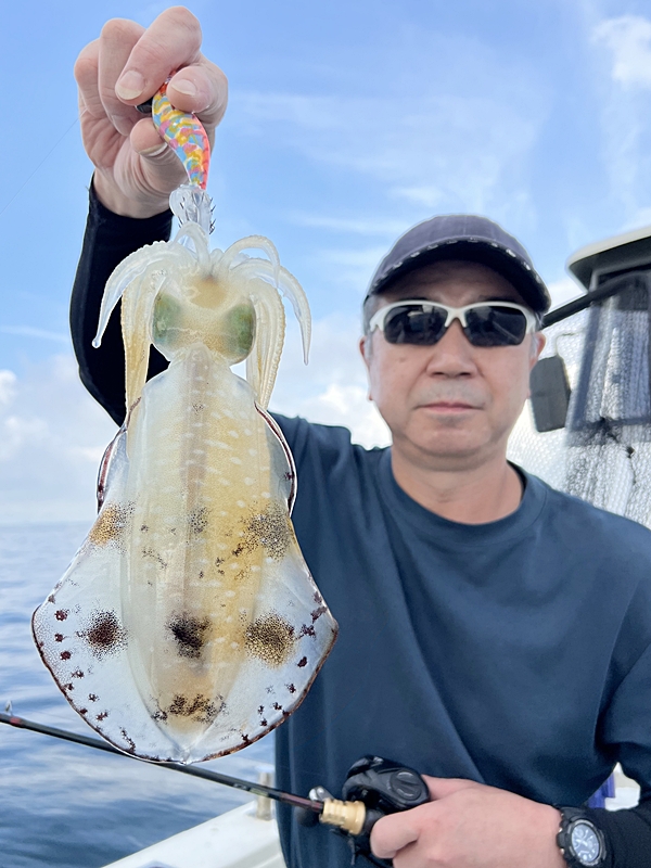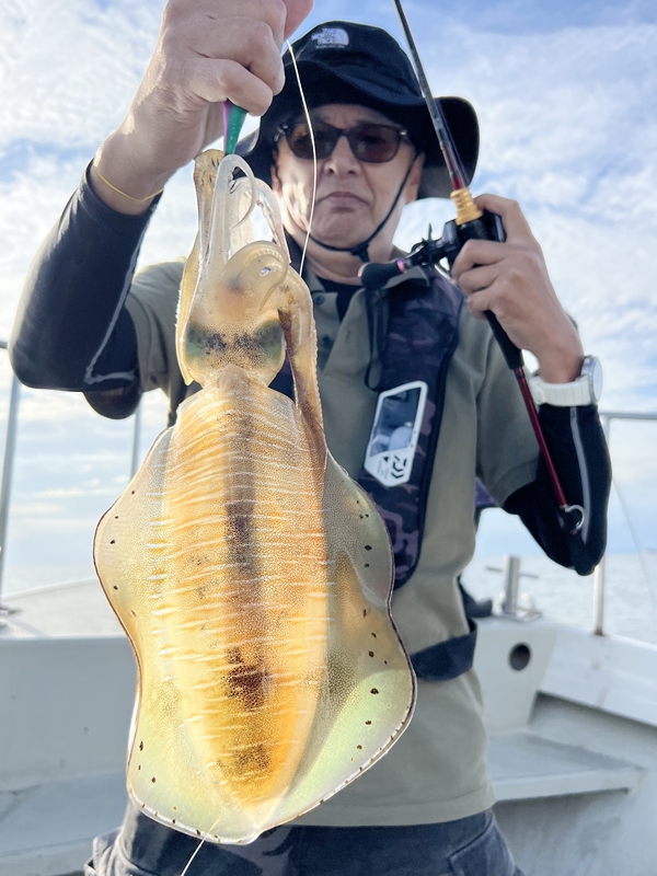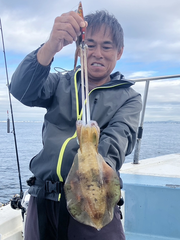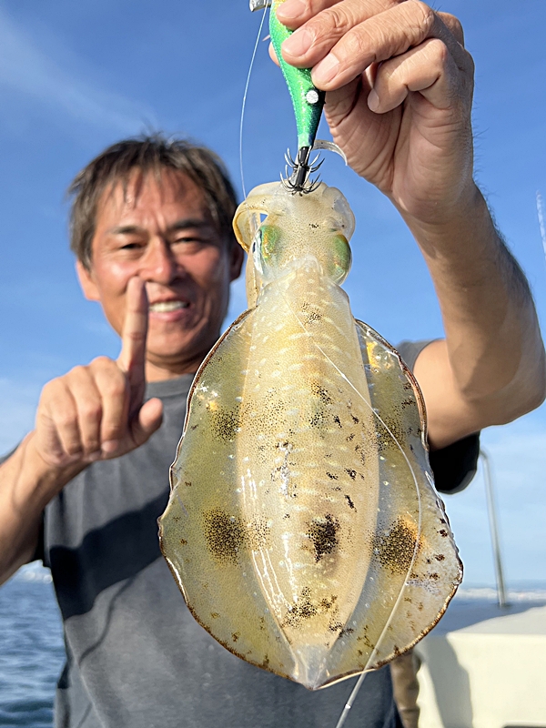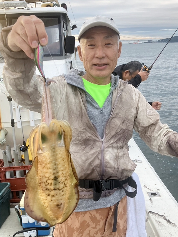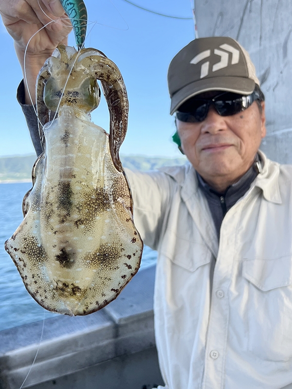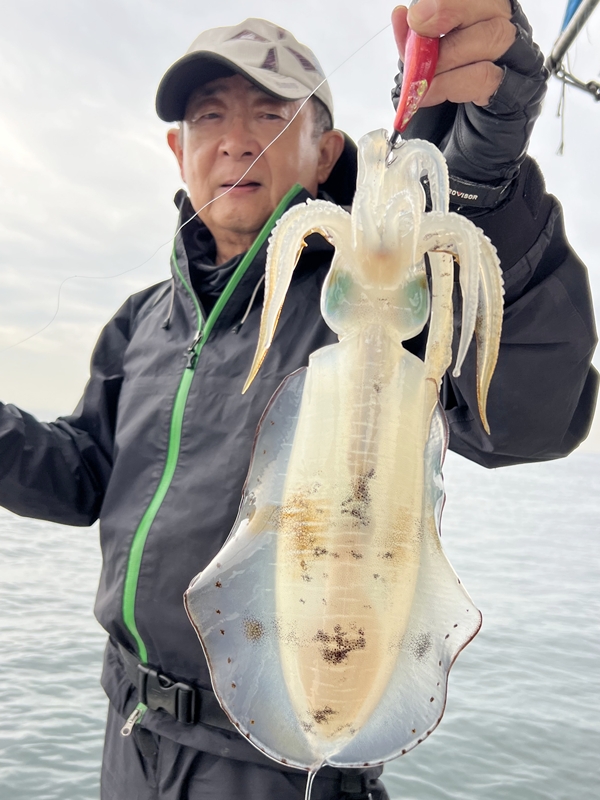 朝便 晴れ アオリイカ便 (淡路沖) アオリイカ20~25cmを17杯。 (0~3杯) コウイカ12~16cmを12杯。 (0~3杯) トップは横野さんでアオリ3杯、コウイカ3杯でした。 鯛カブラ便 (淡路沖) マダイ25~45cmを6匹。 (0~2匹) メジロ65cmを1匹。 トップは下江さんで2匹でした。 |