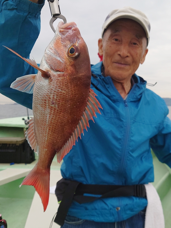 昼便 曇 鯛カブラ便 (淡路沖) マダイ25~79cmを37匹。 (0~8匹) アコウ38~40cmを2匹。 (0~1匹) トップは戸谷さんで8匹でした。 アオリイカ便 (淡路沖) アオリイカ17~23.5cmを17杯。 (0~7杯) コウイカ12~15cmを15杯。 (0~3杯) トップは薮井さんで7杯でした。 |